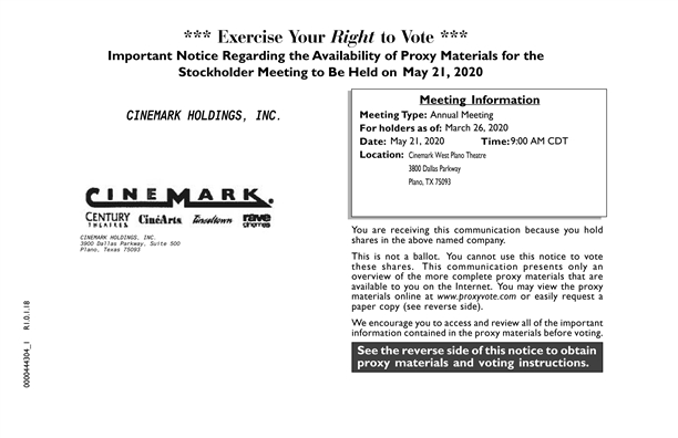 *** Exercise Your Right to Vote *** Important Notice Regarding the Availability of Proxy Materials for the Stockholder Meeting to Be Held on <mtgdate> May 21, 2020 . Meeting Information Meeting Type: Annual Meeting <mtgtype> CINEMARK HOLDINGS, INC. March 26, 2020 For holders as of: <recdate> May 21, 2020 9:00 AM CDT Date: Time: <mtgtime> Location: Cinemark West Plano Theatre 3800 Dallas Parkway Plano, TX 75093 You are receiving this communication because you hold CINEMARK HOLDINGS, INC. shares in the above named company. 3900 Dallas Parkway, Suite 500 Plano, Texas 75093 This is not a ballot. You cannot use this notice to vote these shares. This communication presents only an overview of the more complete proxy materials that are available to you on the Internet. You may view the proxy materials online at www.proxyvote.com or easily request a paper copy (see reverse side). We encourage you to access and review all of the important information contained in the proxy materials before voting. See the reverse side of this notice to obtain proxy materials and voting instructions. 0000444304_1 R1.0.1.18*** Exercise Your Right to Vote *** Important Notice Regarding the Availability of Proxy Materials for the Stockholder Meeting to Be Held on <mtgdate> May 21, 2020 .. Meeting Information Meeting Type: Annual Meeting <mtgtype> CINEMARK HOLDINGS, INC. March 26, 2020 For holders as of: <recdate> May 21, 2020 9:00 AM CDT Date: Time: <mtgtime> Location: Cinemark West Plano Theatre 3800 Dallas Parkway Plano, TX 75093 You are receiving this communication because you hold CINEMARK HOLDINGS, INC. shares in the above named company. 3900 Dallas Parkway, Suite 500 Plano, Texas 75093 This is not a ballot. You cannot use this notice to vote these shares. This communication presents only an overview of the more complete proxy materials that are available to you on the Internet. You may view the proxy materials online at www.proxyvote.com or easily request a paper copy (see reverse side). We encourage you to access and review all of the important information contained in the proxy materials before voting. See the reverse side of this notice to obtain proxy materials and voting instructions. 0000444304_1 R1.0.1.18