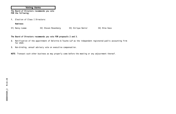 Voting items The Board of Directors recommends you vote FOR the following: 1. Election of Class I Directors: Nominees 01) Nancy Loewe 02) Steven Rosenberg 03) Enrique Senior 04) Nina Vaca The Board of Directors recommends you vote FOR proposals 2 and 3. 2. Ratification of the appointment of Deloitte & Touche LLP as the independent registered public accounting firm for 2020. 3. Non-binding, annual advisory vote on executive compensation. NOTE: Transact such other business as may properly come before the meeting or any adjournment thereof. 0000444304_3 R1.0.1.18Voting items The Board of Directors recommends you vote FOR the following: 1. Election of Class I Directors: Nominees 01) Nancy Loewe 02) Steven Rosenberg 03) Enrique Senior 04) Nina Vaca The Board of Directors recommends you vote FOR proposals 2 and 3. 2. Ratification of the appointment of Deloitte & Touche LLP as the independent registered public accounting firm for 2020. 3. Non-binding, annual advisory vote on executive compensation. NOTE: Transact such other business as may properly come before the meeting or any adjournment thereof. 0000444304_3 R1.0.1.18